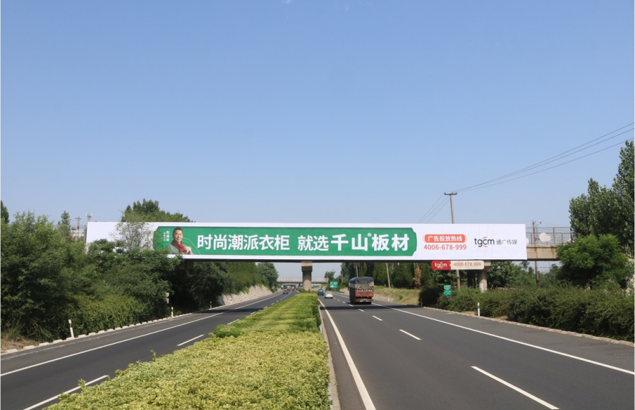 近日,千山在山東省重點高速路段投放14座跨線橋和立柱媒體廣告,再次橫跨山東省內多條主干線,如泰新高速、京臺高速、日蘭高速、青銀高速等,覆蓋山東省及其他省市區域。高速廣告形式依舊涵蓋跨線橋、單立柱等,廣告畫面鮮艷,以綠色為主色調,可視距離美觀、簡潔,進一步將“時尚潮派衣柜 就選千山板材”的品牌主張傳遞給更多的消費
