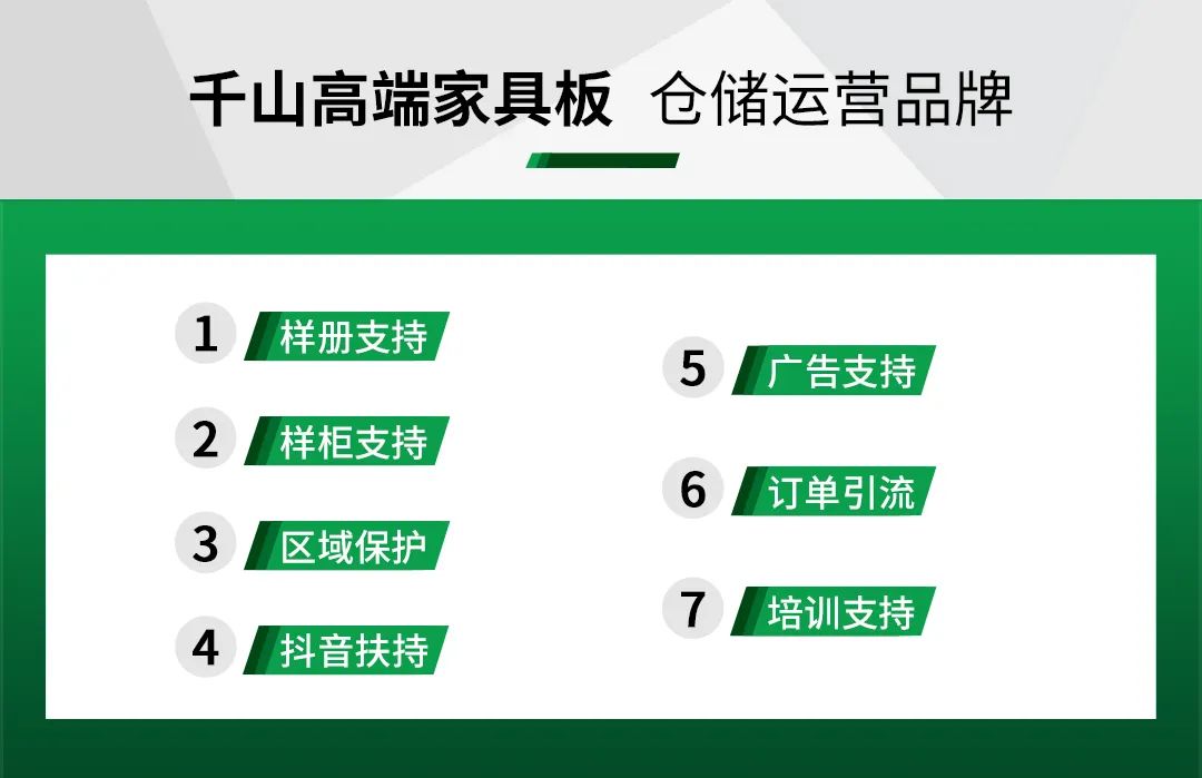 千山擁有完善的加盟體系,全國“一縣一代”火熱招商,更有樣冊支持、樣柜支持、區(qū)域保護、抖音扶持、廣告支持、訂單引流、培訓(xùn)支持7大政策支持,全方位助力經(jīng)銷商伙伴贏戰(zhàn)終端市場。