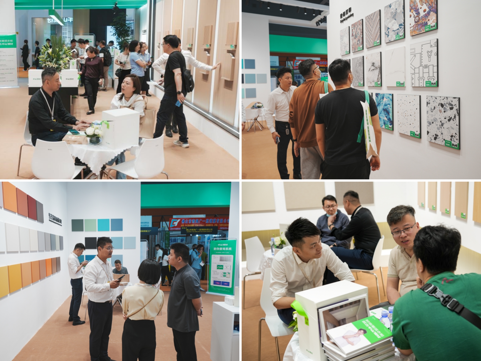 千山板材展館以2.0品牌風格呈現,整體采用暖白和品牌綠色為主色調,通過對造型與大膽跳色的運用,與6大系列潮流花色和諧搭配,彰顯年輕時尚的品牌形象。