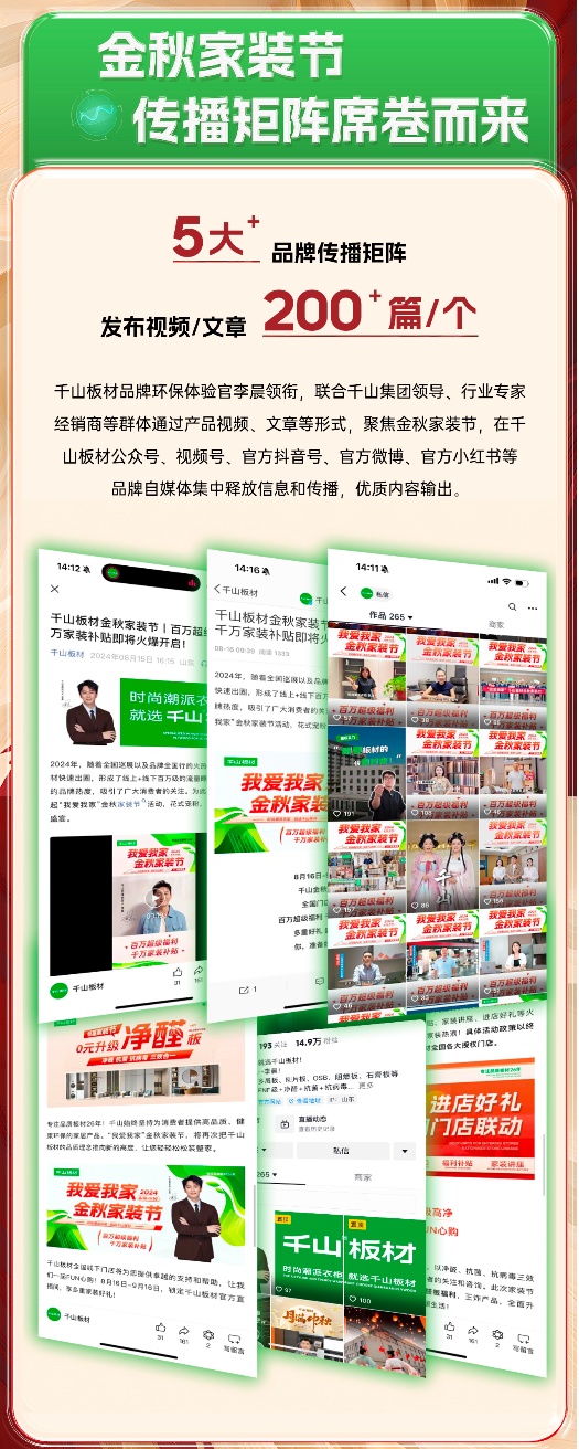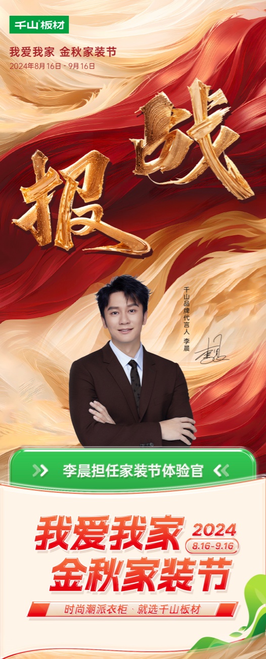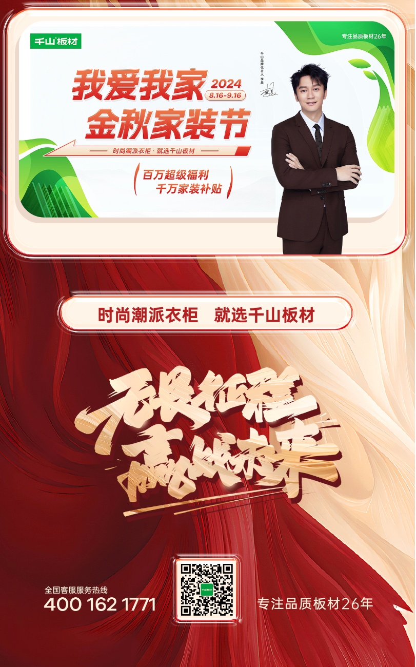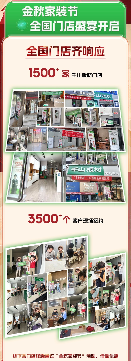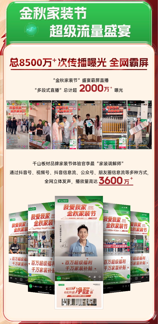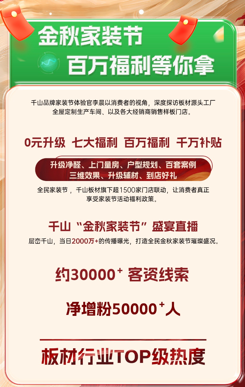 8月16日,千山金秋家裝節火爆上線,截至9月16日,為期30天的家裝節活動日前正式落下帷幕?;顒悠陂g,千山板材全國1500+門店聯動,全網曝光量超8500萬、線上直播觀看量超2000萬、簽約數量達3500+,實現了品牌聲量和銷售業績的雙豐收!