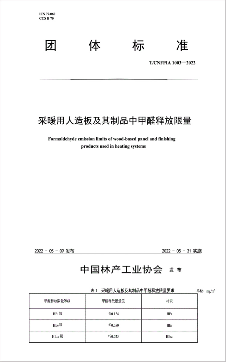 T/CNFPIA 1003-2022《采暖用人造板及其制品中甲醛釋放限量》團體標準自2022年5月31日起實施,甲醛釋放量分為三個分級,分別為HE1(≤0.124mg/m3)、HE0(≤0.050mg/m3)、HENF(≤0.025mg/m3)。