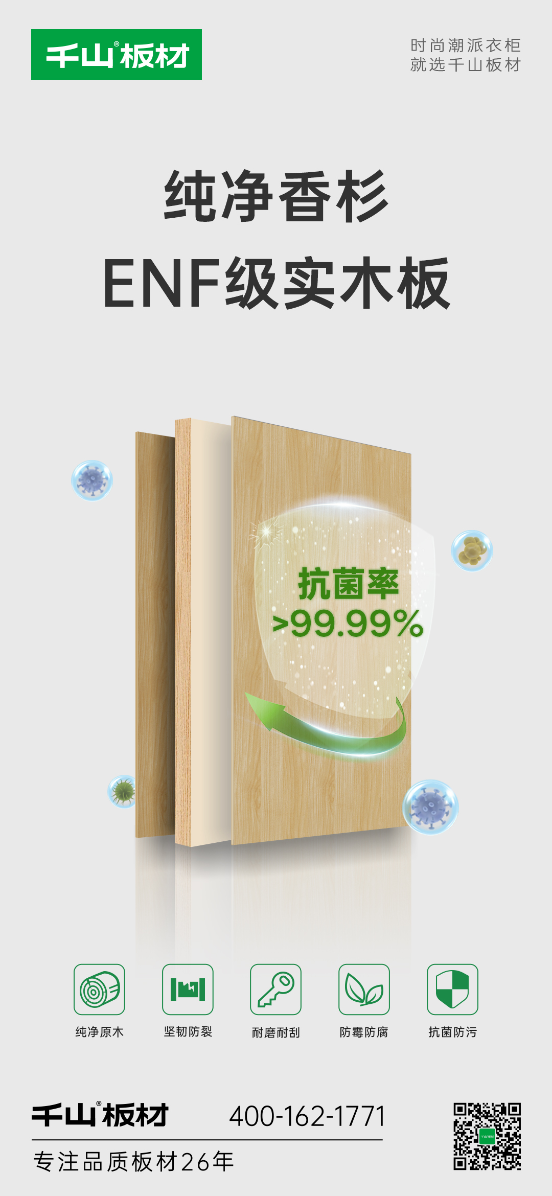 千山板材實木板順勢而生,甄選天然香杉木為原料,自帶原木醇香,實木芯性能更優異,環保達國標最高ENF級,用品質呵護我們的家居健康。
