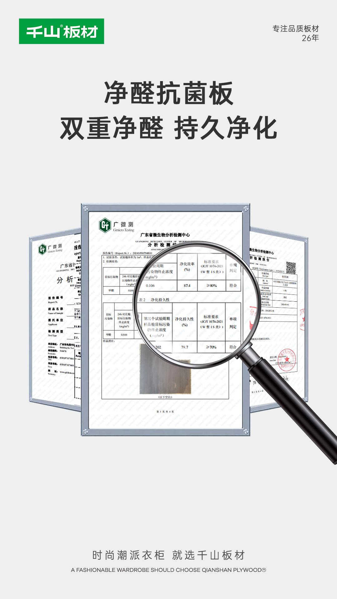 千山板材凈醛板采用ENF級無醛添加基材,涵蓋刨片板、多層板、實木板,以六大硬核優勢強效發力,凈醛、抗菌、抗病毒三效合一,開啟環保新“凈”界,從源頭打造“無醛”之家。
