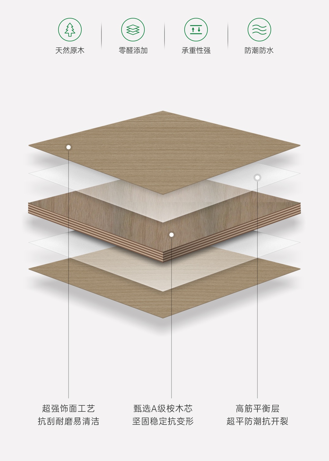 優質基材經過全周期養生、篩選、烘干、熱壓、砂光等24道標準工藝,并通過吸水膨脹率、耐濕、內結合強度等多項專業檢測,防潮抗變形,品質更出眾。