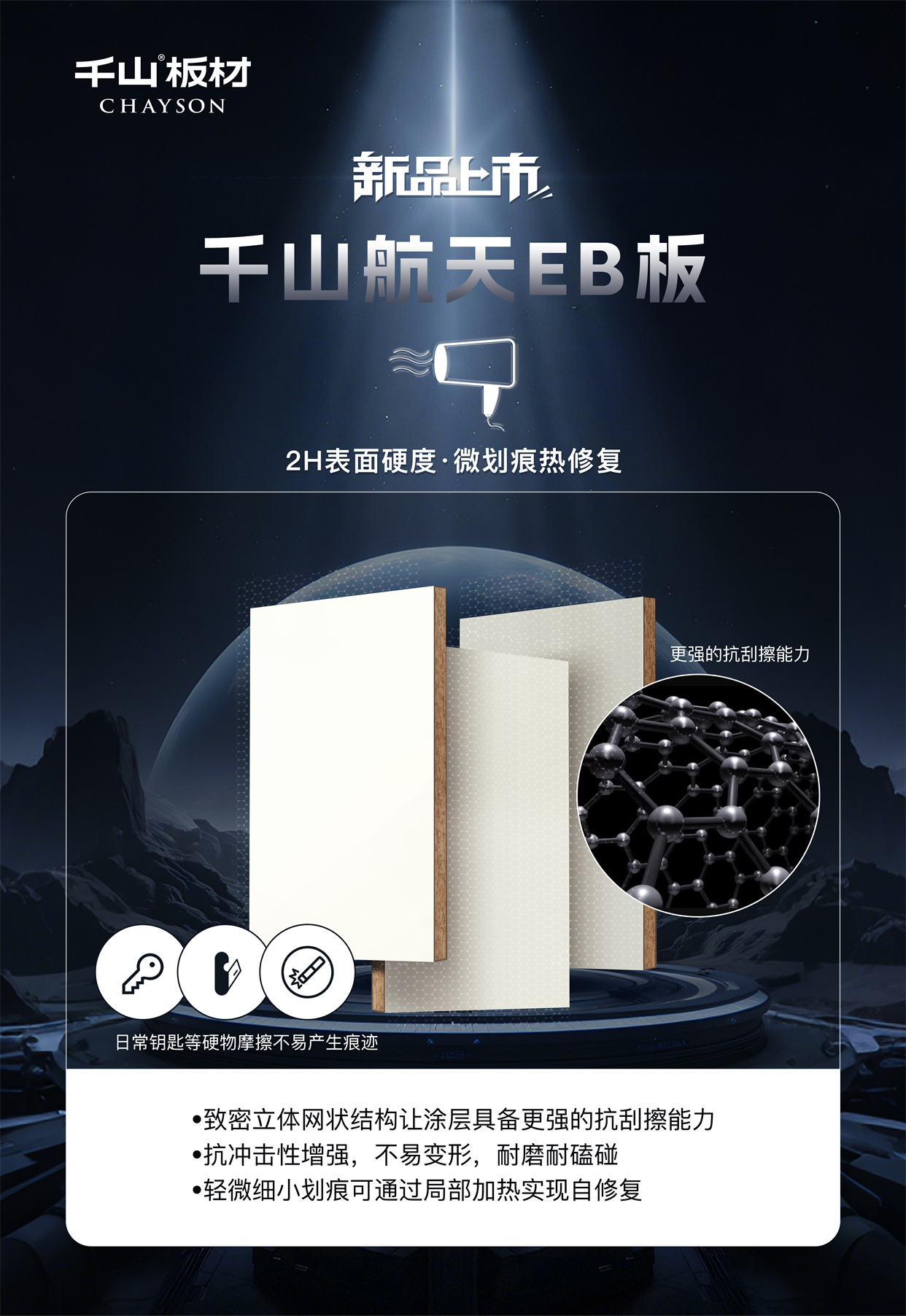 千山板材汲取航天科技靈感,重磅推出新一代高端門板產品——千山航天EB板,以“黑科技”工藝,將卓越的物理性能與高級質感完美融合,為我們的家居空間披上“高能鎧甲”!