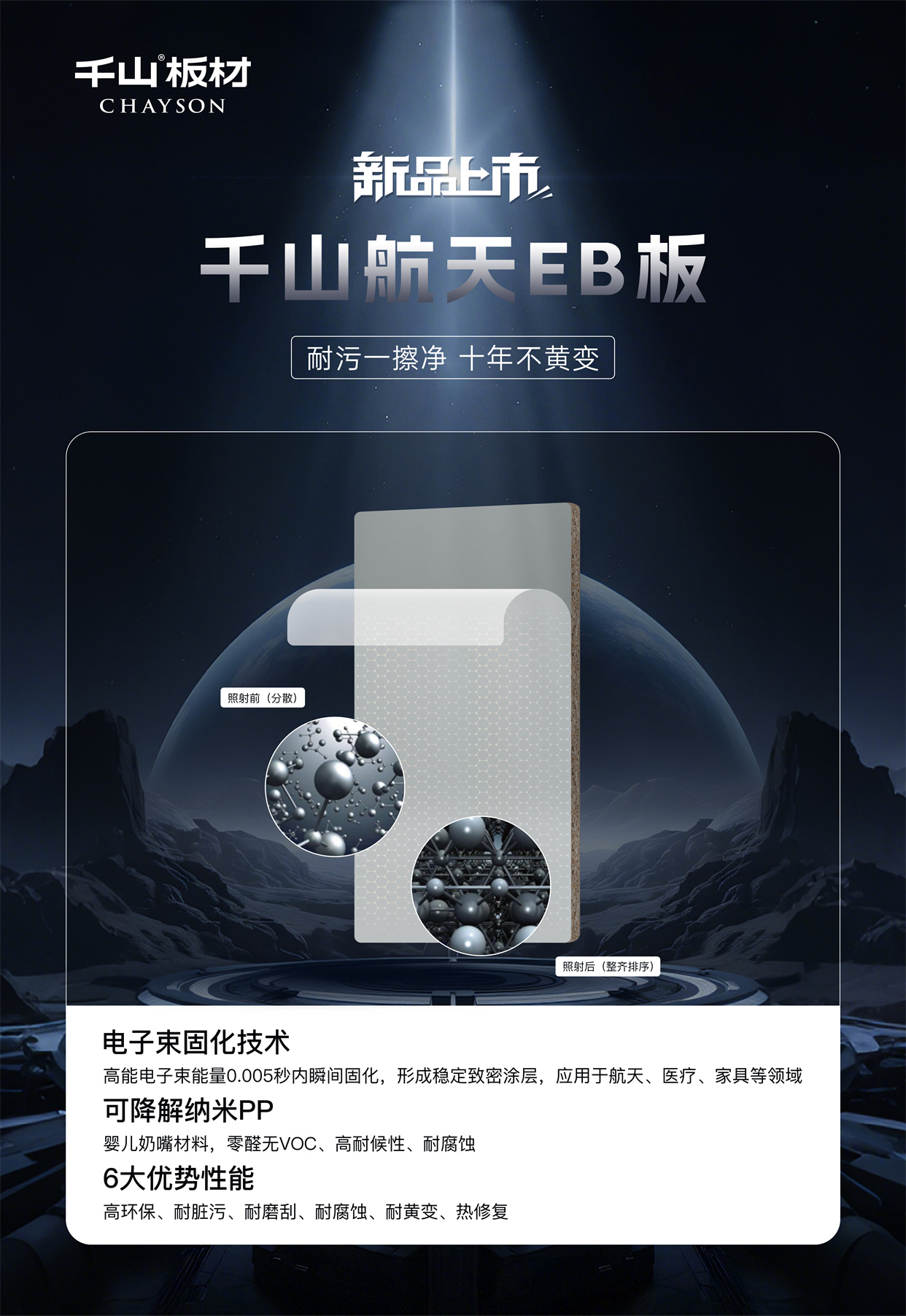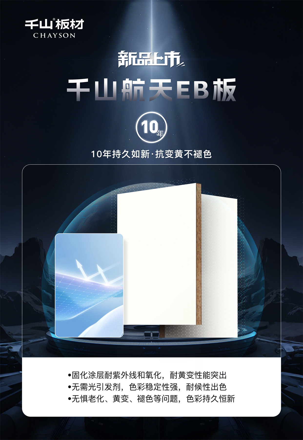千山航天EB板:耐污一擦凈,十年不黃變!讓黑科技點亮家的奢顏,用高能品質守護健康空間,歡迎當地專賣店鑒賞咨詢。