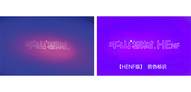 千山板材每張板材表面都印有隱形防偽標識,使用紫光手電筒照射板材表面,HENF級板材顯現“千山板材HENF”;ENF級和E0級板材顯現“千山板材”。